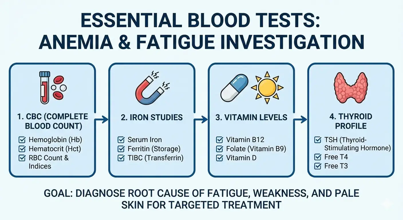 If fatigue persists or anemia does not fully explain symptoms, additional testing helps uncover underlying metabolic or hormonal contributors: