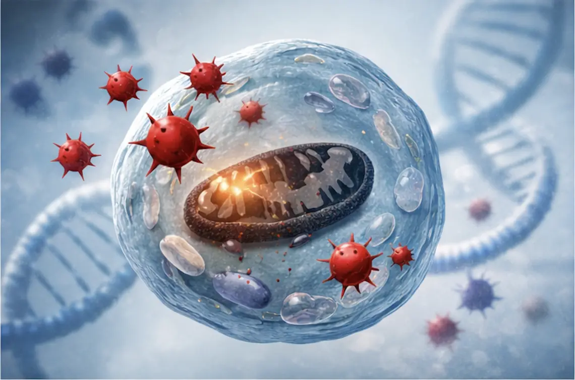 Oxidative Stress Excess free radicals damage cellular structures such as DNA, proteins, and cell membranes. This gradually disrupts normal cellular repair mechanisms. Damages mitochondria (the cell’s energy producers), leading to fatigue, slower recovery, and gradual metabolic decline.
